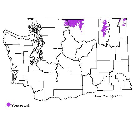 Boreal Chickadees are uncommon year round in high-elevation forests at the northern border of Washington in the North Cascades, Kettle, and Selkirk Mountains. Only Whatcom, Okanogan, Ferry, and Pend Oreille Counties have confirmed breeding-season records. They can be common in some areas including Freezeout Ridge, Roger Lake, and Long Swamp in Okanogan County.